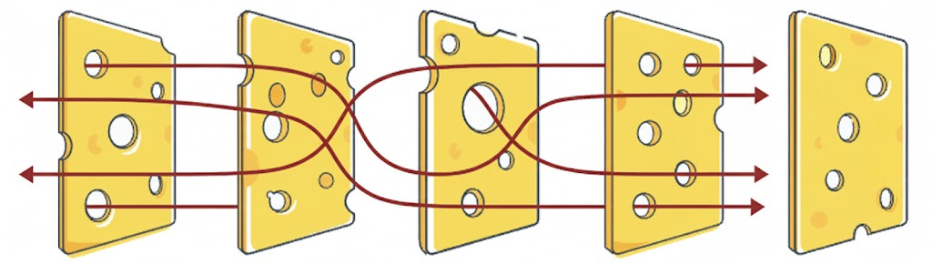Relatedly, in cases where the threat is from an intelligent adversary (rather than a natural threat), the adversary may be able to go around or through all layers below some level of robustness, so any single highly secure layer would be preferable. An intelligent adversary can probe all defensive layers, and target their attack to the weakest point of each layer (swerving through the holes in the swiss cheese, in the figure below2). Indeed, an attacker at a sufficient capability level may be able to overcome an arbitrary number of weaker defensive layers for very little extra effort. E.g. no amount of consumer-grade firewalls and anti-virus software and access controls and so forth could prevent a state-level cyber attacker who could use zero-day exploits even if you do all the basic things right – it is better to have one highly secure layer.